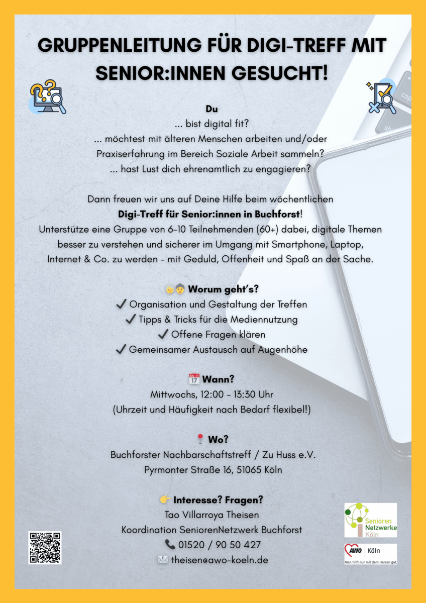 Lust auf Engagement? Der Digi-Treff in Buchforst ist auf der Suche nach einer Gruppenleitung. Weitere Infos und Kontaktdaten im Anhang: